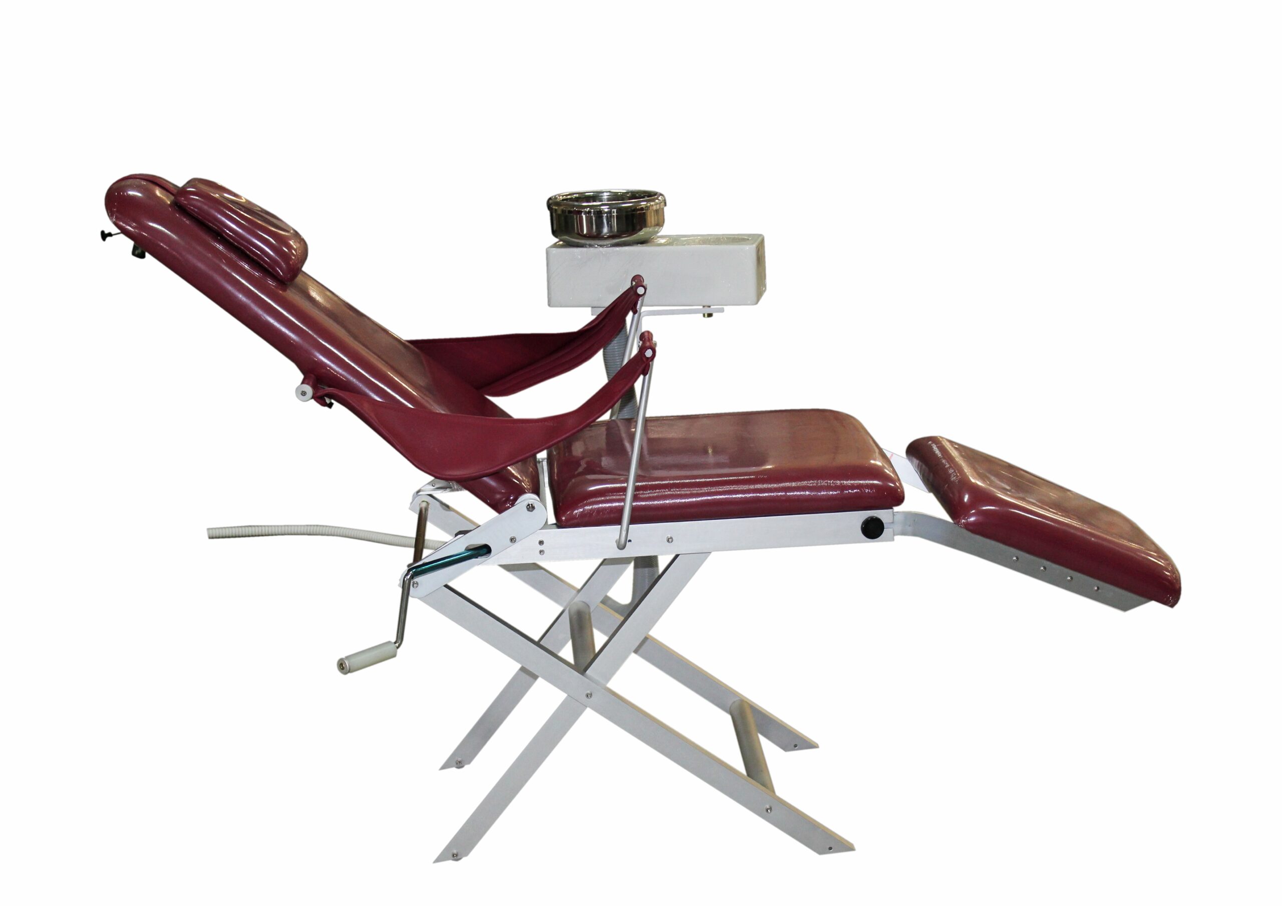 Portable dental chair with light, spittoon & instrument tray ensures comprehensive dental care with optimal visibility.